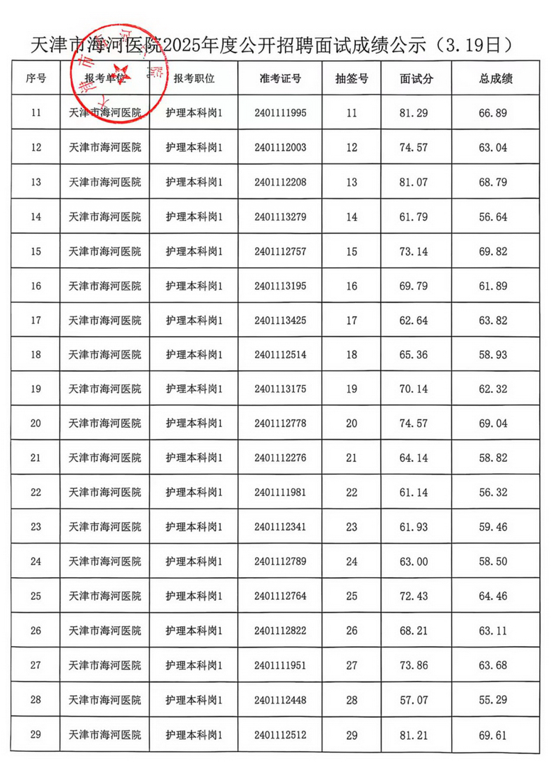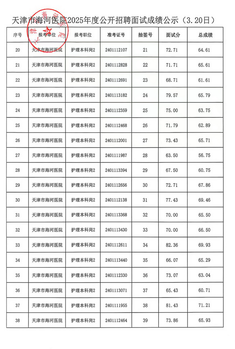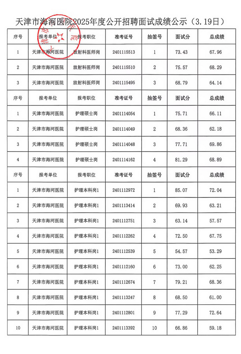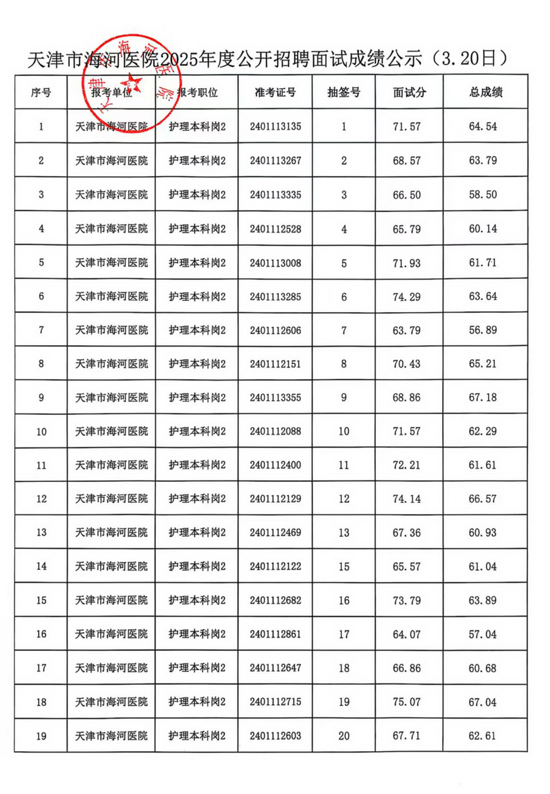 天津市海河医院2025年度公开招聘面试成绩公示(3.19日、3.20日)