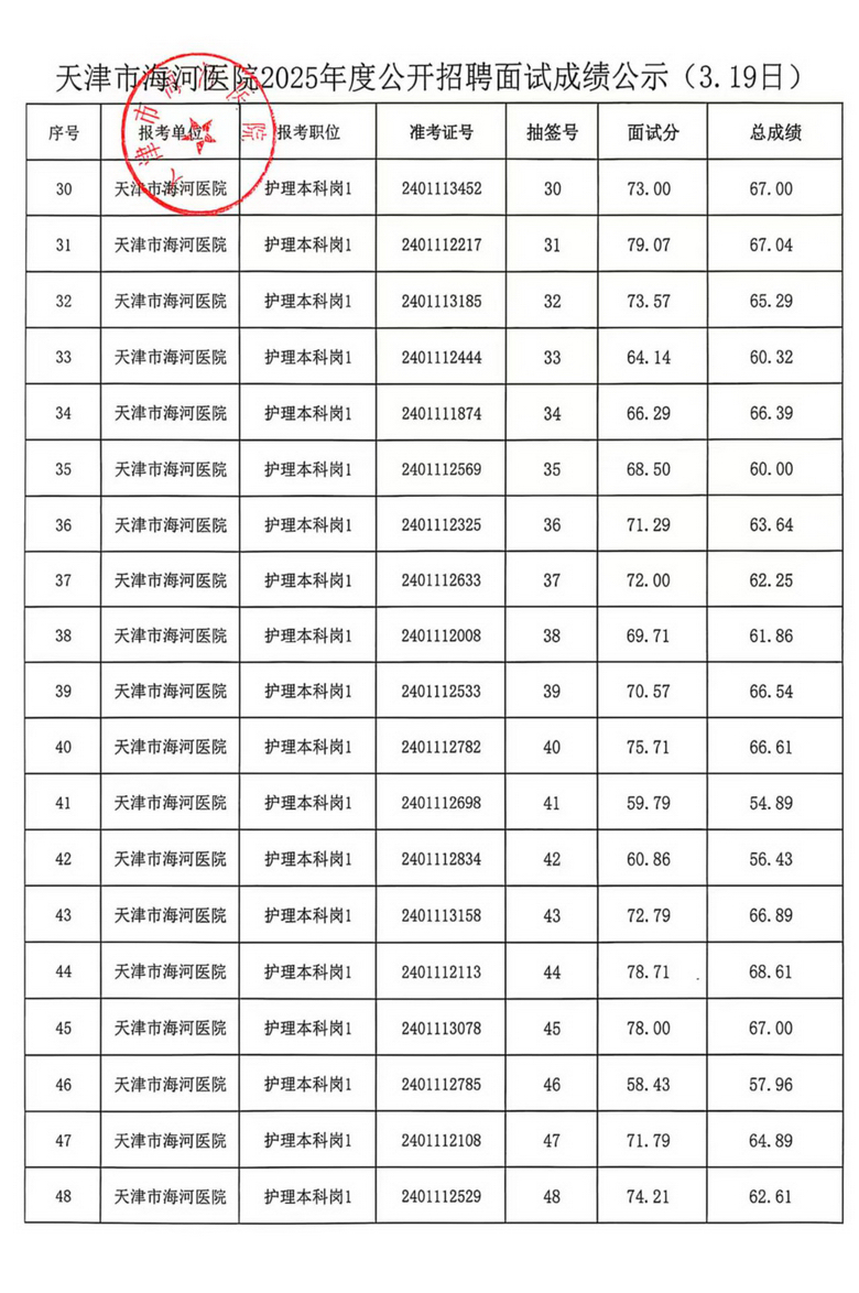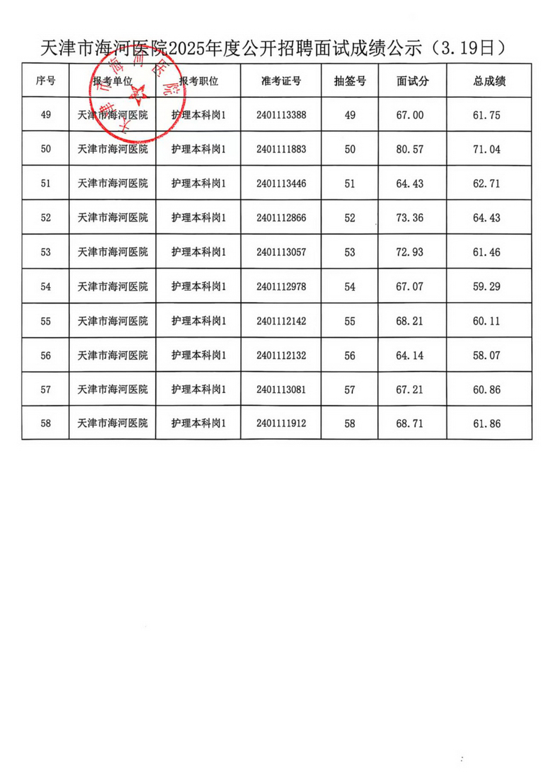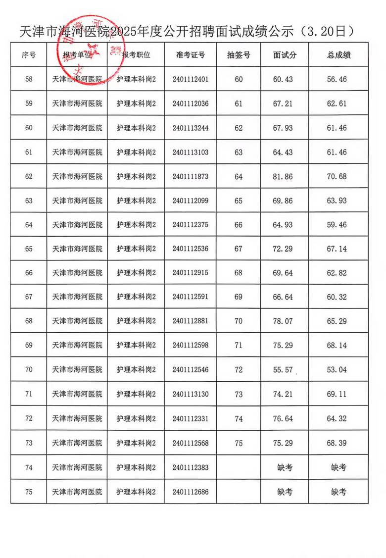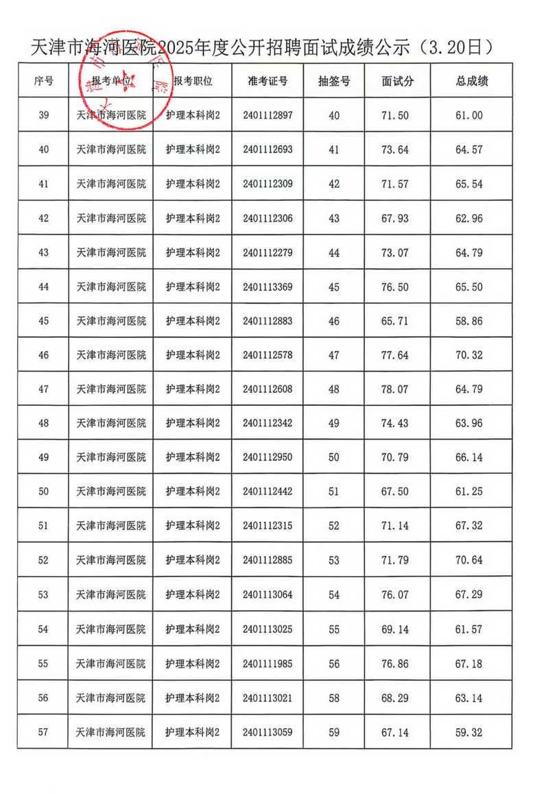 天津市海河医院2025年度公开招聘面试成绩公示(3.19日、3.20日)