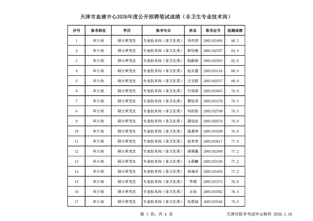 - 天津市第四中心医院2026年度公开招聘笔试成绩公示