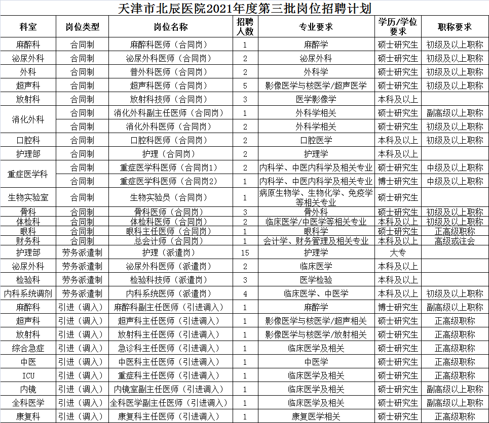 天津市北辰医院2021年度第三批岗位招聘公告