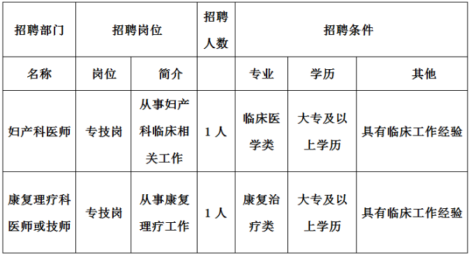 为满足我院业务发展需求,面向社会公开招聘专业技术人员,拟招妇产科医师1名、康复理疗科医师1名或技师1名(医师优先)。现将有关事项公告如下: