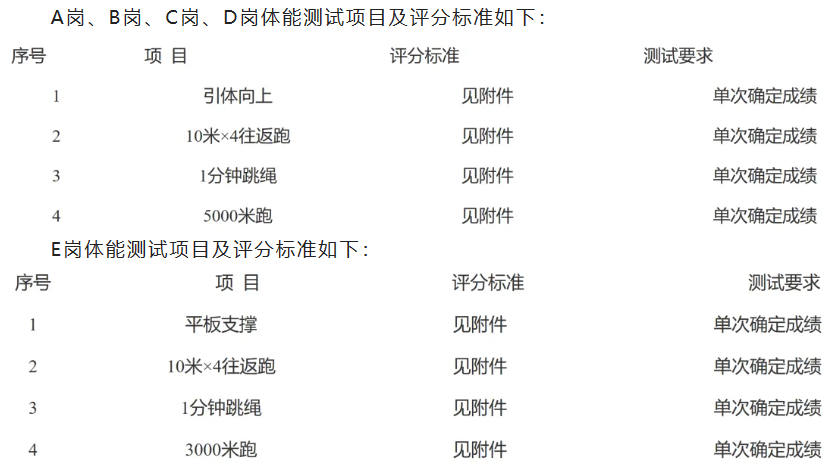体能测试每项分值100分,满分400分。体能测试评分标准参照公安部治安管理局印发的《公安特警队专业训练与考核大纲》(2024年版)。