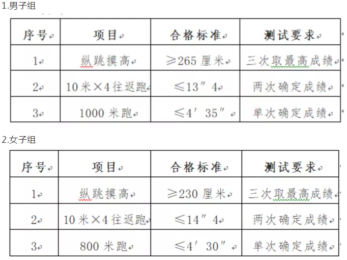 在规定集合时间内未进场点录人员记为缺考,不得参加资格复审与体能测试;弄虚作假者,一经发现,取消考试资格。体能测试采取单项淘汰方式进行,凡一项不达标的视为体能测试不合格。体能测试成绩将于测试当日进行公布,并由考生签字确认。