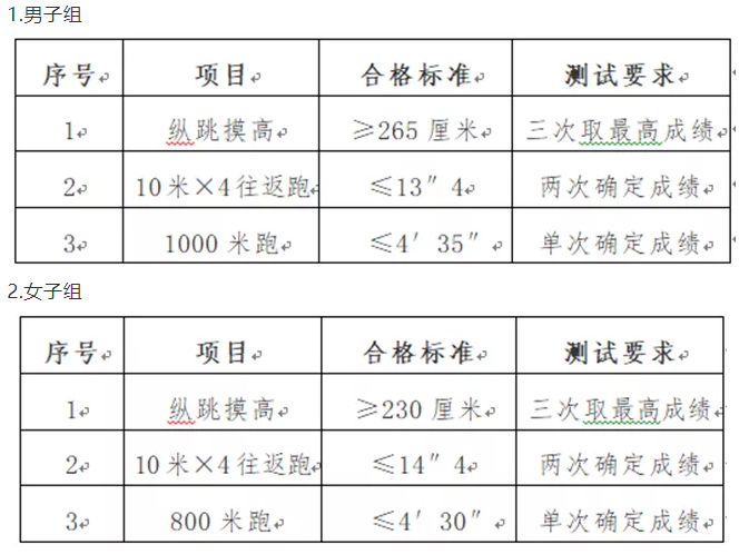 体能测试项目及合格标准如下: