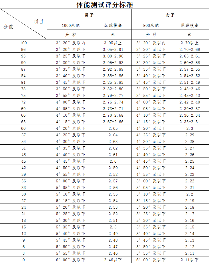 体能测试成绩满分100分。体能测试包括两个项目:男子1000米跑、女子800米跑和纵跳摸高,每项满分为100分。测试后,按照两项各占50%的比例合成体能测试成绩。体能测试成绩满60分即为合格,不合格不可参加后续环节。项目及评分标准如下: