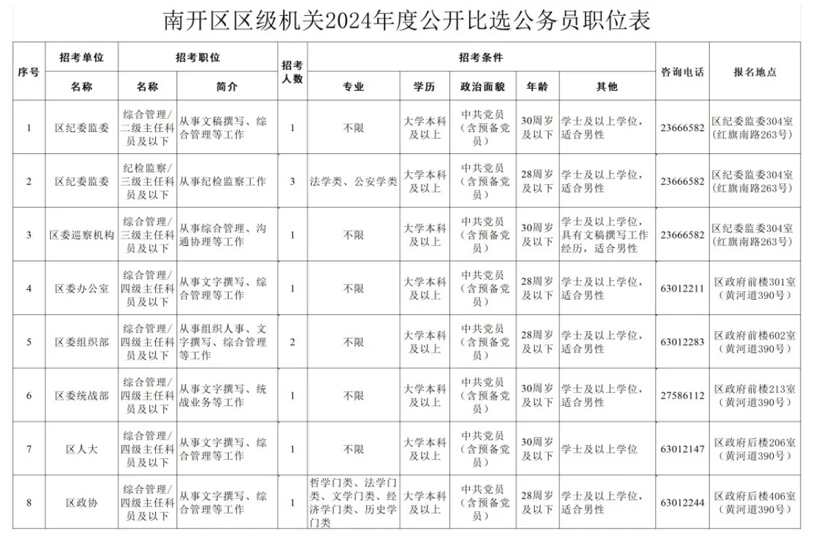 比选职位、数量和资格条件等内容可查询《南开区区级机关2024年度公开比选公务员职位表》。