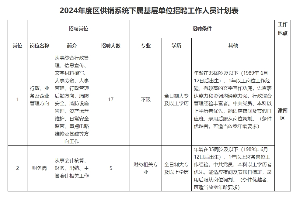 3.年龄在35周岁及以下(1989年6月12日后出生),中共党员,综合条件优越者可适当放宽年龄;各岗位具体年龄要求等详见《2024年度区供销系统下属基层单位招聘工作人员计划表》;