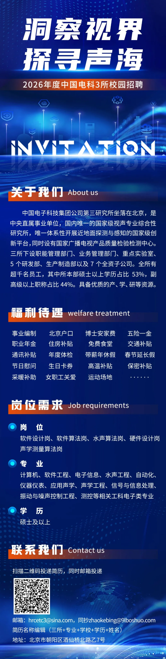 中国电子科技集团公司第三研究所 时间:2026-04-07 10:08 作者:吴老师 半月讲坛温馨提示:信息均转载自官方网站,仅供参考,不构成相关服务。其最终解释权归相关单位所有,如对信息有疑问,请直接与相关单位联系。转载目的在于信息传递,我司不承担此类稿件其他行为的连带责任,如有侵权或需删除请联系我们。因此带来的不便敬请谅解! (责任编辑:吴老师) 上一篇:北京大学天然药物及仿生药物全国重点实验室实验技术岗位招聘启事 下一篇:中国移动终端公司2026春季校园招聘