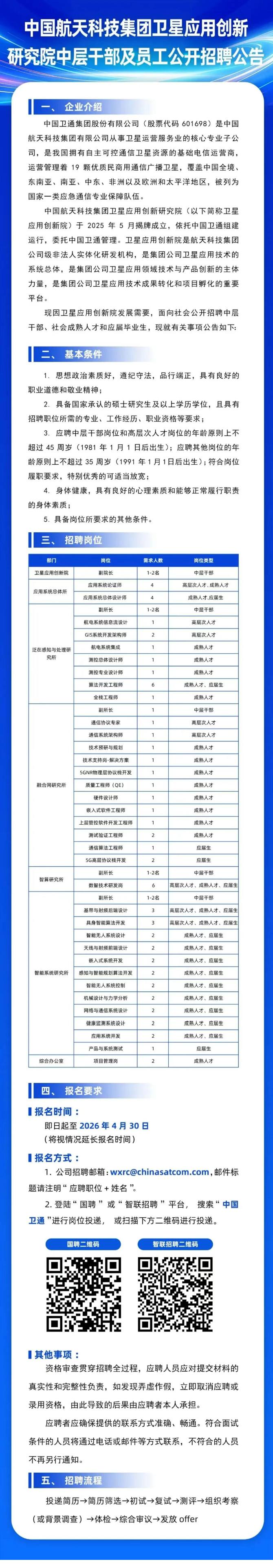 中国航天科技集团卫星应用创新研究院中层干部及员工公开招聘公告 时间:2026-04-07 14:47 作者:吴老师 半月讲坛温馨提示:信息均转载自官方网站,仅供参考,不构成相关服务。其最终解释权归相关单位所有,如对信息有疑问,请直接与相关单位联系。转载目的在于信息传递,我司不承担此类稿件其他行为的连带责任,如有侵权或需删除请联系我们。因此带来的不便敬请谅解! (责任编辑:吴老师) 上一篇:中国电子所属中国长城面向社会公开招聘计算产业攻坚人才 下一篇:维信诺2026届春季校园招聘