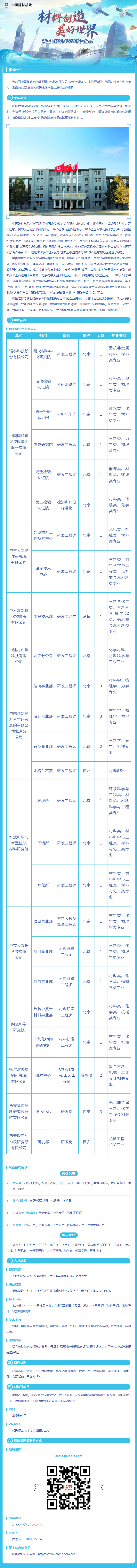 中国建材总院2026届毕业生招聘公告 时间:2026-04-15 16:44 作者:吴老师 半月讲坛温馨提示:信息均转载自官方网站,仅供参考,不构成相关服务。其最终解释权归相关单位所有,如对信息有疑问,请直接与相关单位联系。转载目的在于信息传递,我司不承担此类稿件其他行为的连带责任,如有侵权或需删除请联系我们。因此带来的不便敬请谅解! (责任编辑:吴老师) 上一篇:东方电气集团面向全球招聘高层次人才 下一篇:北京师范大学国有资产管理处工作人员招聘启事