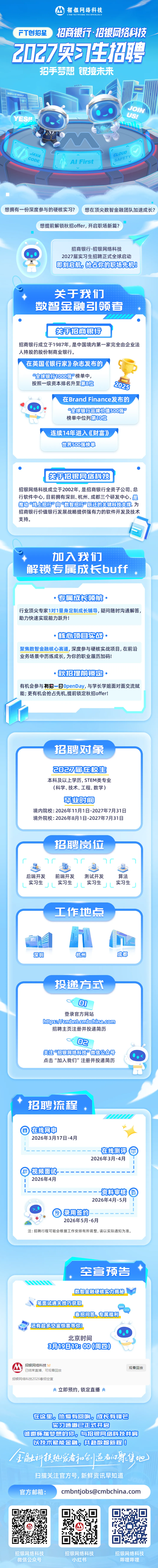 招银网络科技2027届实习生招聘 时间:2026-04-16 11:36 作者:吴老师 半月讲坛温馨提示:信息均转载自官方网站,仅供参考,不构成相关服务。其最终解释权归相关单位所有,如对信息有疑问,请直接与相关单位联系。转载目的在于信息传递,我司不承担此类稿件其他行为的连带责任,如有侵权或需删除请联系我们。因此带来的不便敬请谅解! (责任编辑:吴老师) 上一篇:中国港湾2026届 “领航者” 全球春季招聘 下一篇:北京大学大数据分析与应用技术国家工程实验室招聘1名劳动合同制工作人员