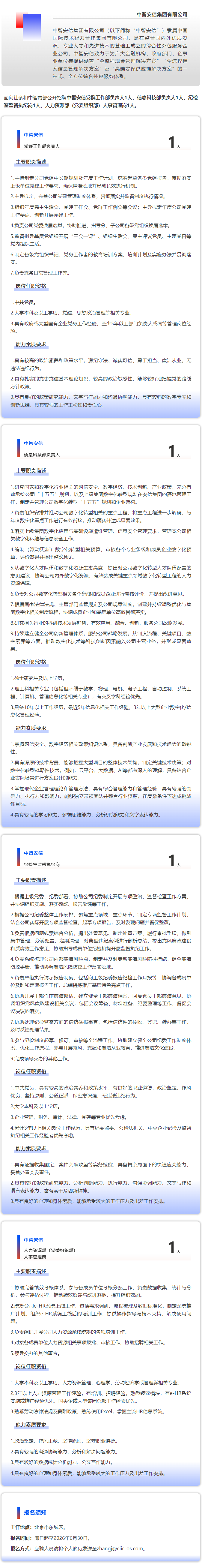 中智集团所属中智安信集团有限公司公开招聘 时间:2026-04-23 15:45 作者:吴老师 半月讲坛温馨提示:信息均转载自官方网站,仅供参考,不构成相关服务。其最终解释权归相关单位所有,如对信息有疑问,请直接与相关单位联系。转载目的在于信息传递,我司不承担此类稿件其他行为的连带责任,如有侵权或需删除请联系我们。因此带来的不便敬请谅解! (责任编辑:吴老师) 上一篇:航天科工集团数字技术有限公司部分岗位公开招聘启事 下一篇:北京大学先进制造与机器人学院招聘1名劳动合同制工作人员