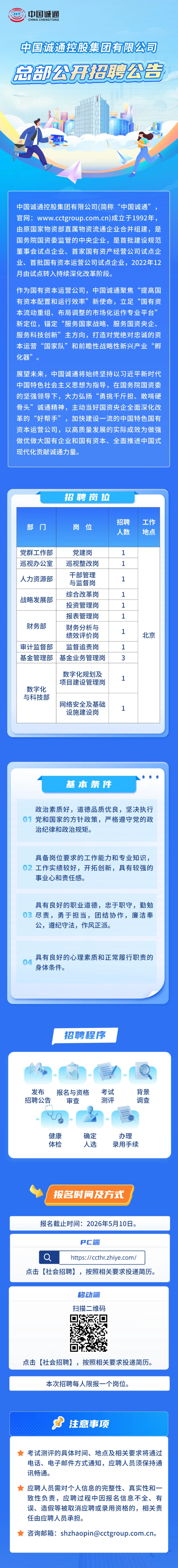 中国诚通控股集团有限公司总部公开招聘公告 时间:2026-04-28 16:10 作者:吴老师 半月讲坛温馨提示:信息均转载自官方网站,仅供参考,不构成相关服务。其最终解释权归相关单位所有,如对信息有疑问,请直接与相关单位联系。转载目的在于信息传递,我司不承担此类稿件其他行为的连带责任,如有侵权或需删除请联系我们。因此带来的不便敬请谅解! (责任编辑:吴老师) 上一篇:天津市远望海外人才服务有限公司招聘 下一篇:国家电投集团钍基能源科技有限公司2026年全球人才招聘公告